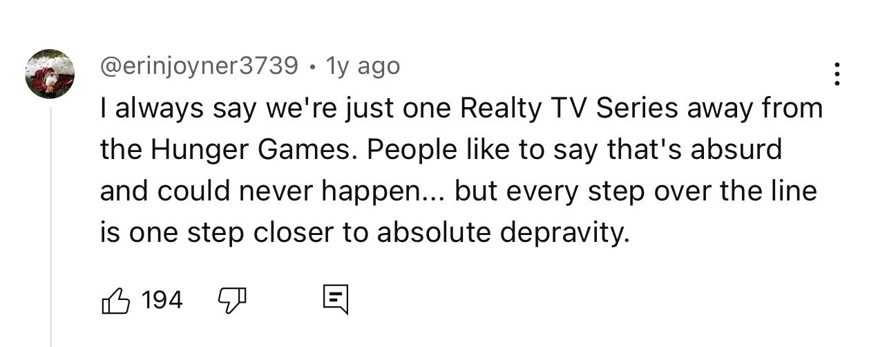 I got curious about what happens to Haymitch in Sunrise on the Reaping so I restarted the books and read The Ballad of Songbirds and Snakes for the first time. (It’s like a 2.5 out of 5, tbh, and the film — paused while I write this — is really missing the interiority of an elitist-turned-fascist main character for the sake of sex appeal.) Whether I chose to revisit unconsciously or not, it all feels eerily timely.
